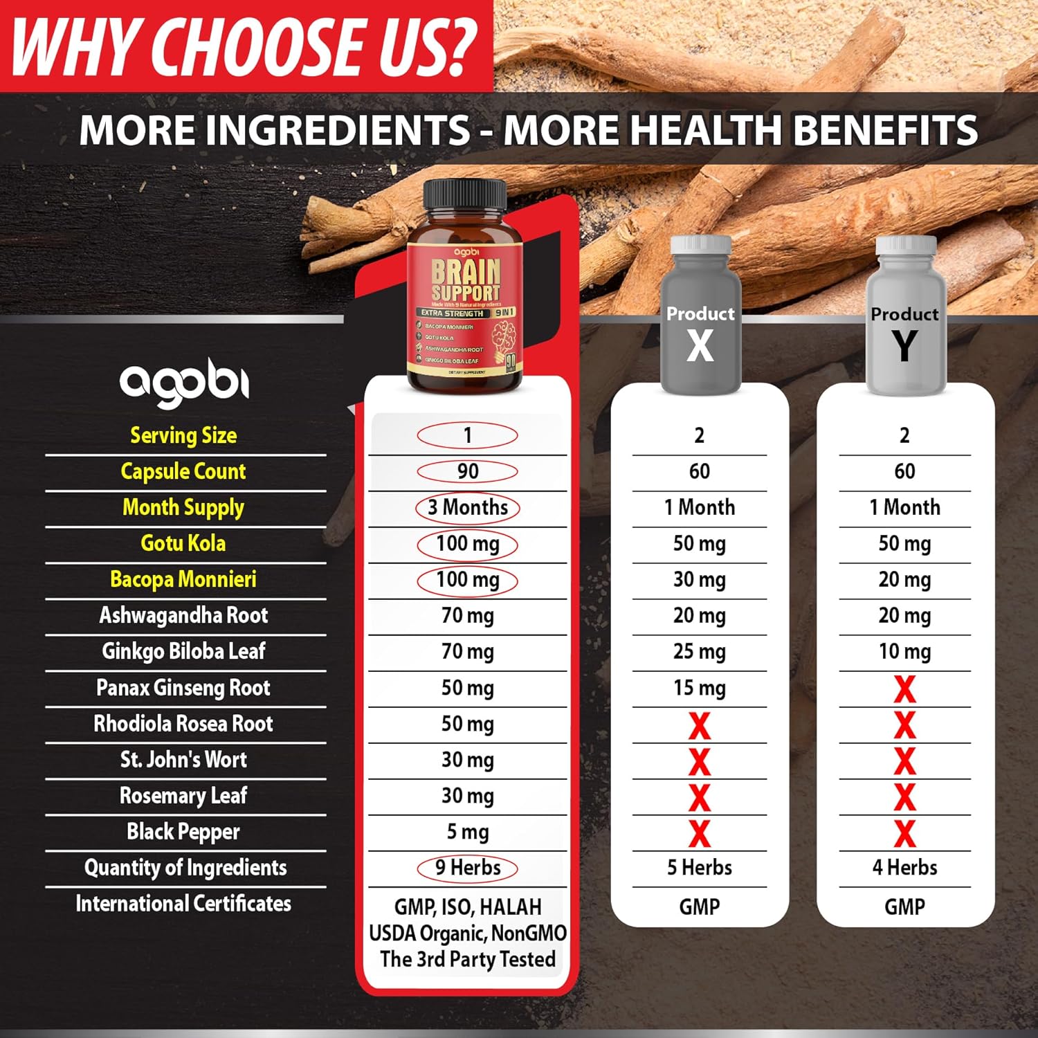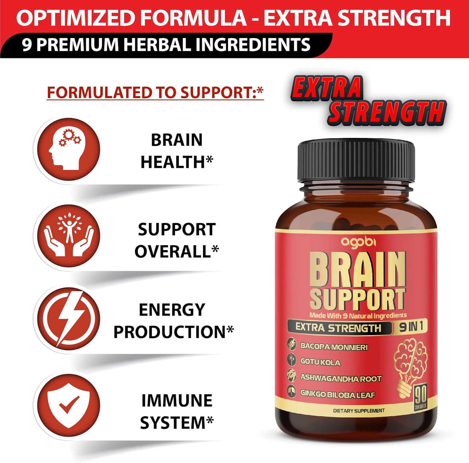 ✅ 9-in-1 Extra Formula Booster with High Absorption Agobi Brain Support Bottle; Support overall brain health, immune system, and energy production for men & women.