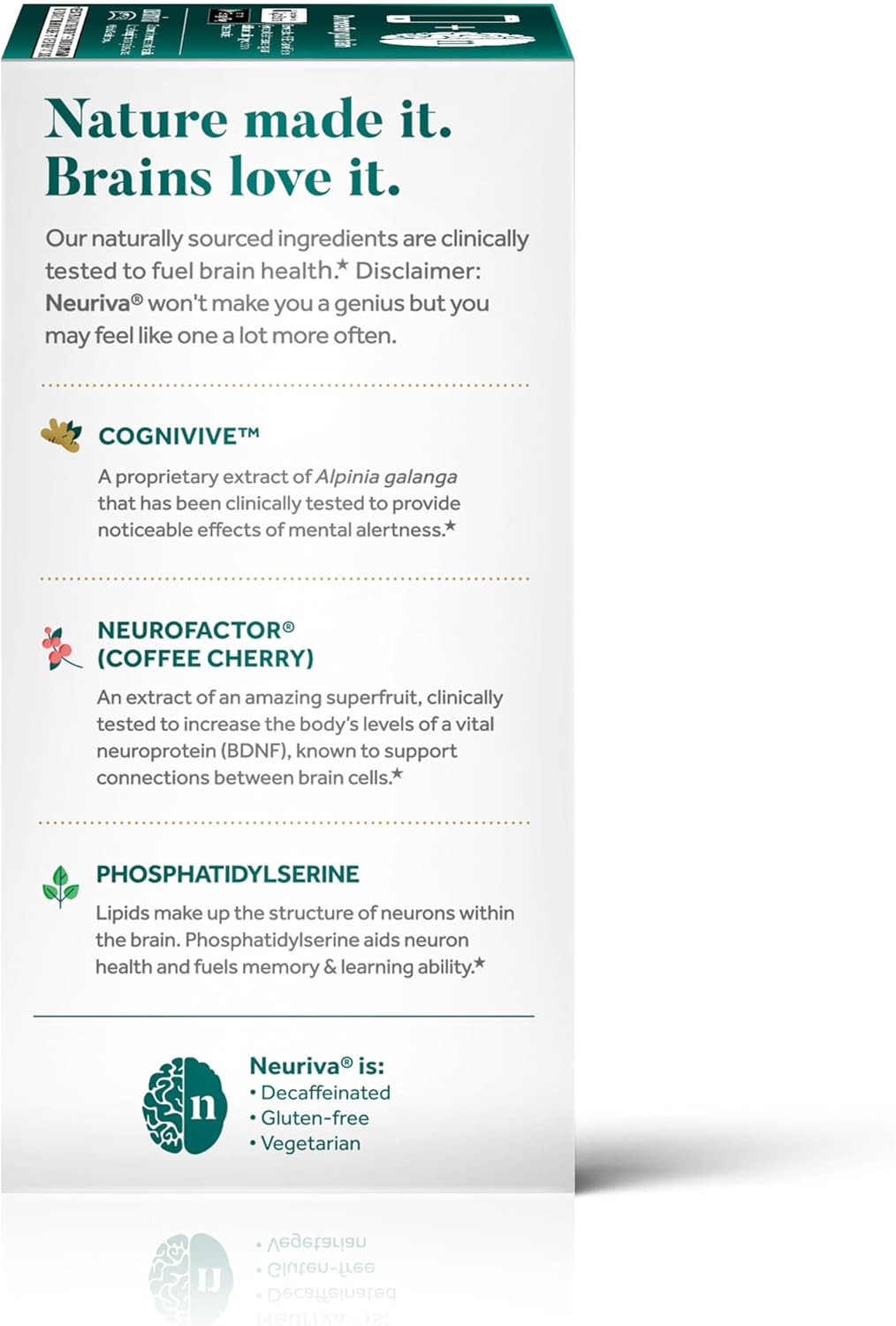 CLINCALLY TESTED, NATURALLY SOURCED INGREDIENTS: Neuriva Ultra contains Neurofactor an extract from the amazing superfruit, coffee cherry. This powerful ingredient has been clinically tested to increase the body’s levels of vital neuroprotein (BDNF), known to support connections between brain cells and plant-sourced Phosphatidylserine, which aids in neuron health and fuels memory and learning.* Pretty impressive, huh?